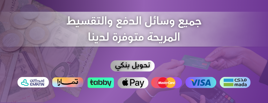 لا تقلق بشأن الدفع نوفر لك كافة الطرق المريحة والآمنة لإتمام طلبك الدفع الفوري عبر أبل باي - مدى أو التحويل البنكي المباشر والتقسيط المريح عبر تابي - تمارا - إمكان.